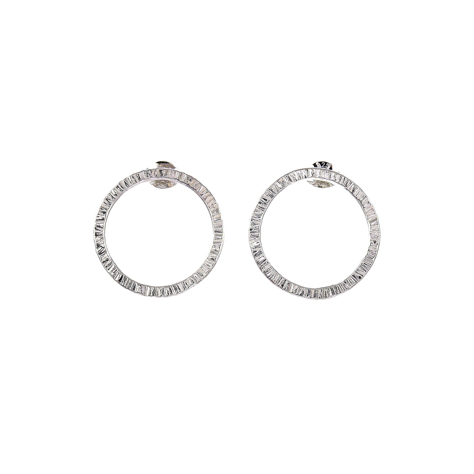 Sterling silver hoops, worn as studs for a classic look the works for all ages. These studs are formed from sterling silver wire and textured by hand, giving each pair a subtle sparkle and unique character. Designed for everyday wear, they measure approximately 22mm in diameter. A smaller version is also available here