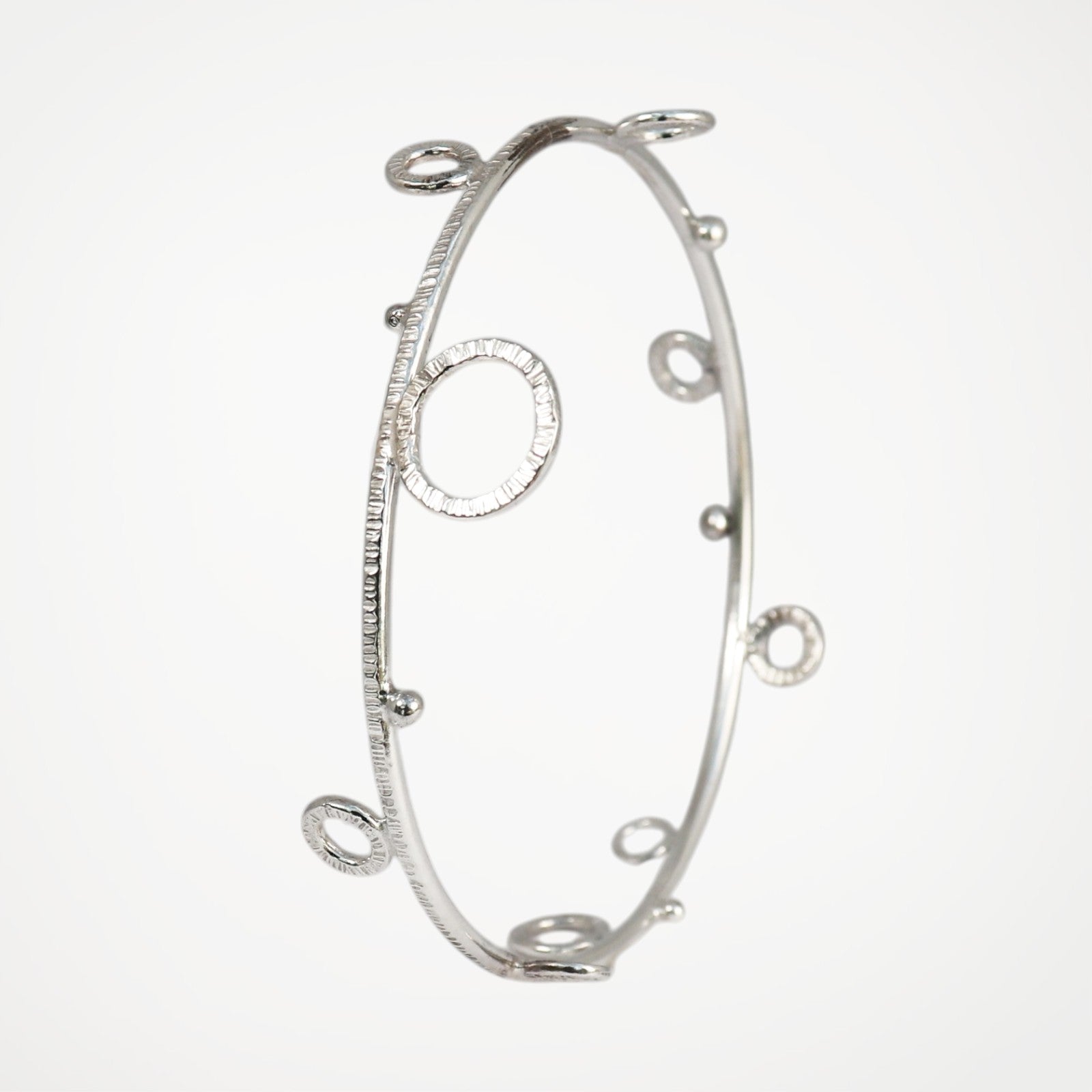 A contemporary silver bangle, handmade with silver wire and finished with a distinctive hammered texture. Elegant yet modern, this piece is bold yet delicate, its open structure making it lightweight and comfortable.