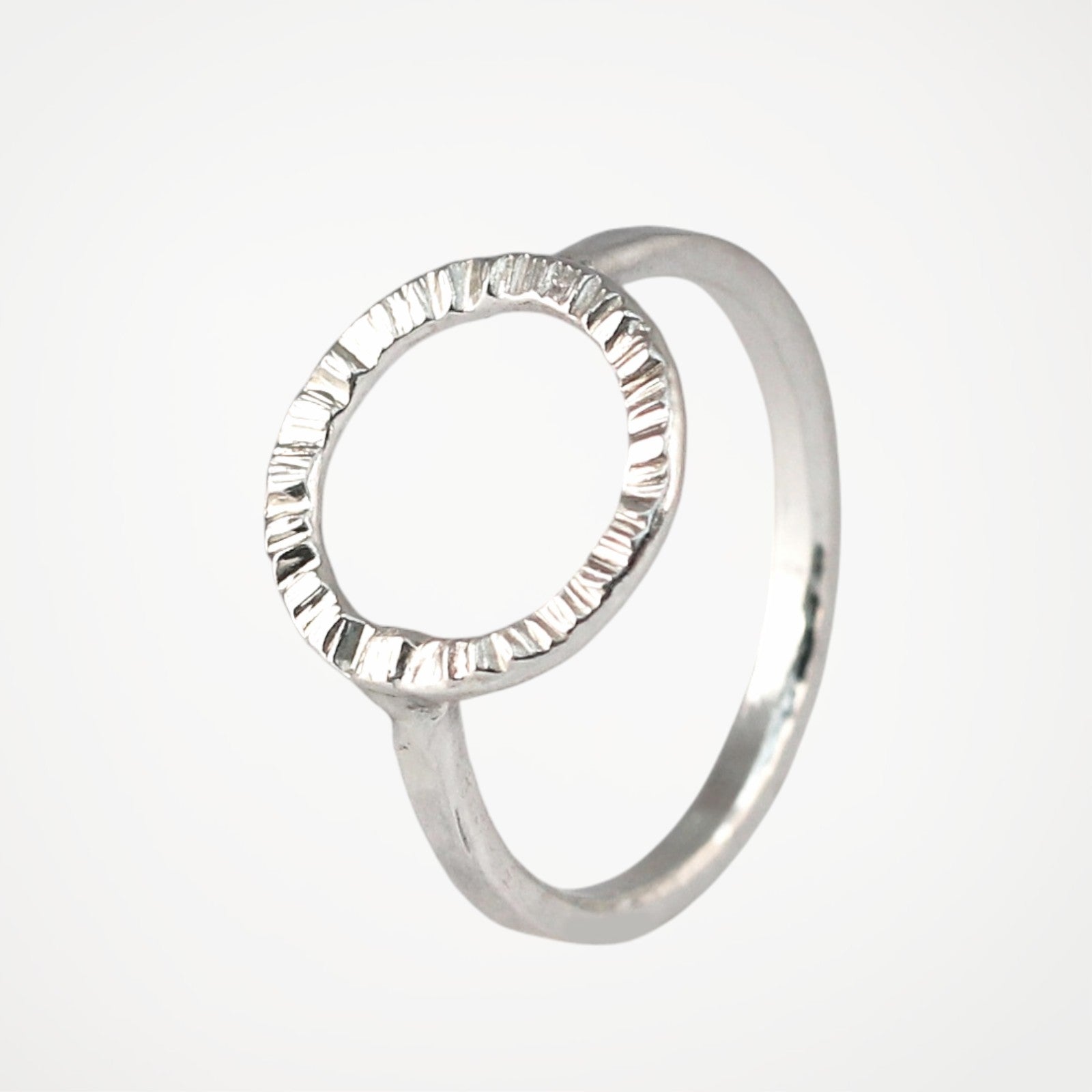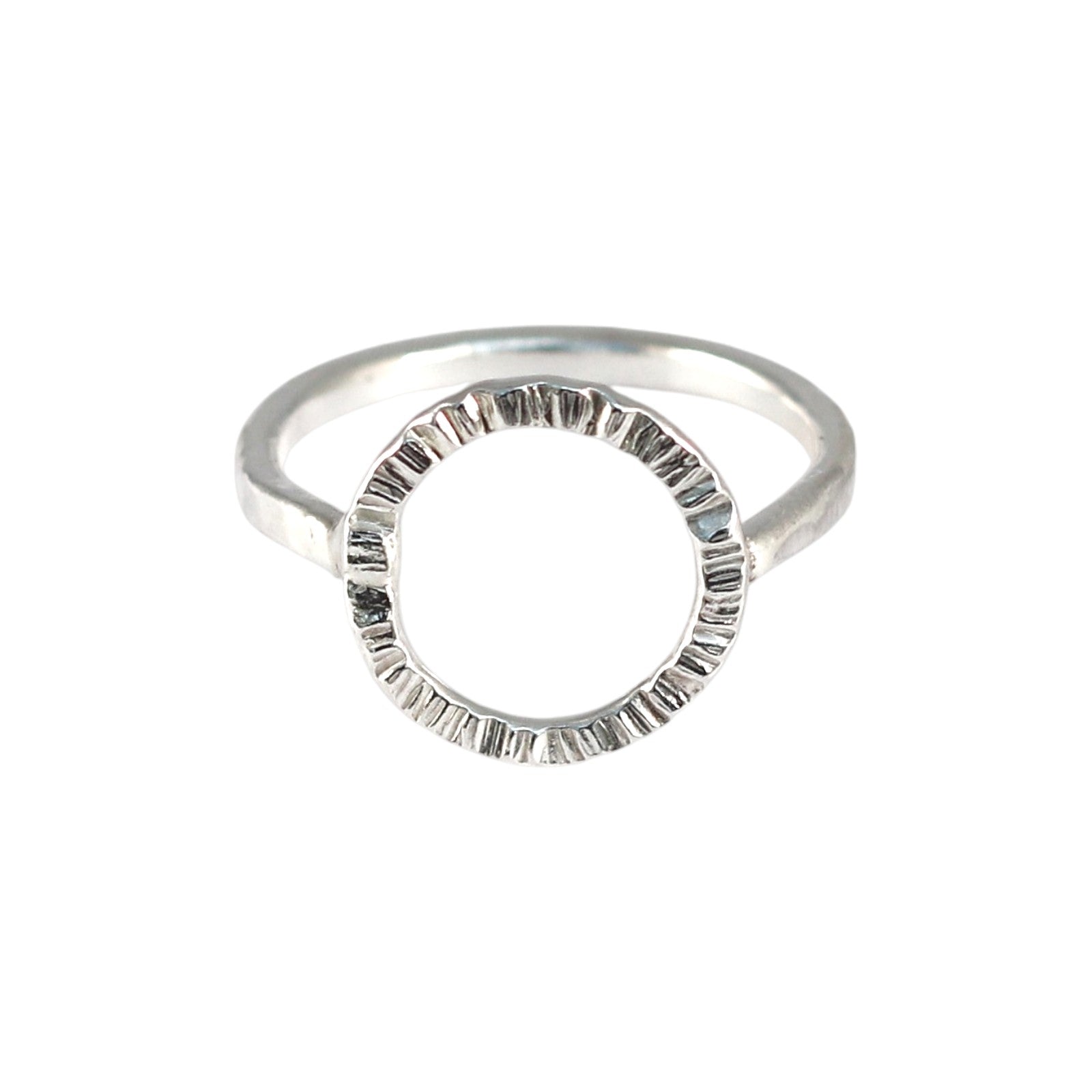 An everyday silver ring featuring a single textured circle on a plain band. Designed to mix and match with other pieces in the collection. Hand-formed from silver wire by Jenny and finished with a hammered texture, echoing the wider range.