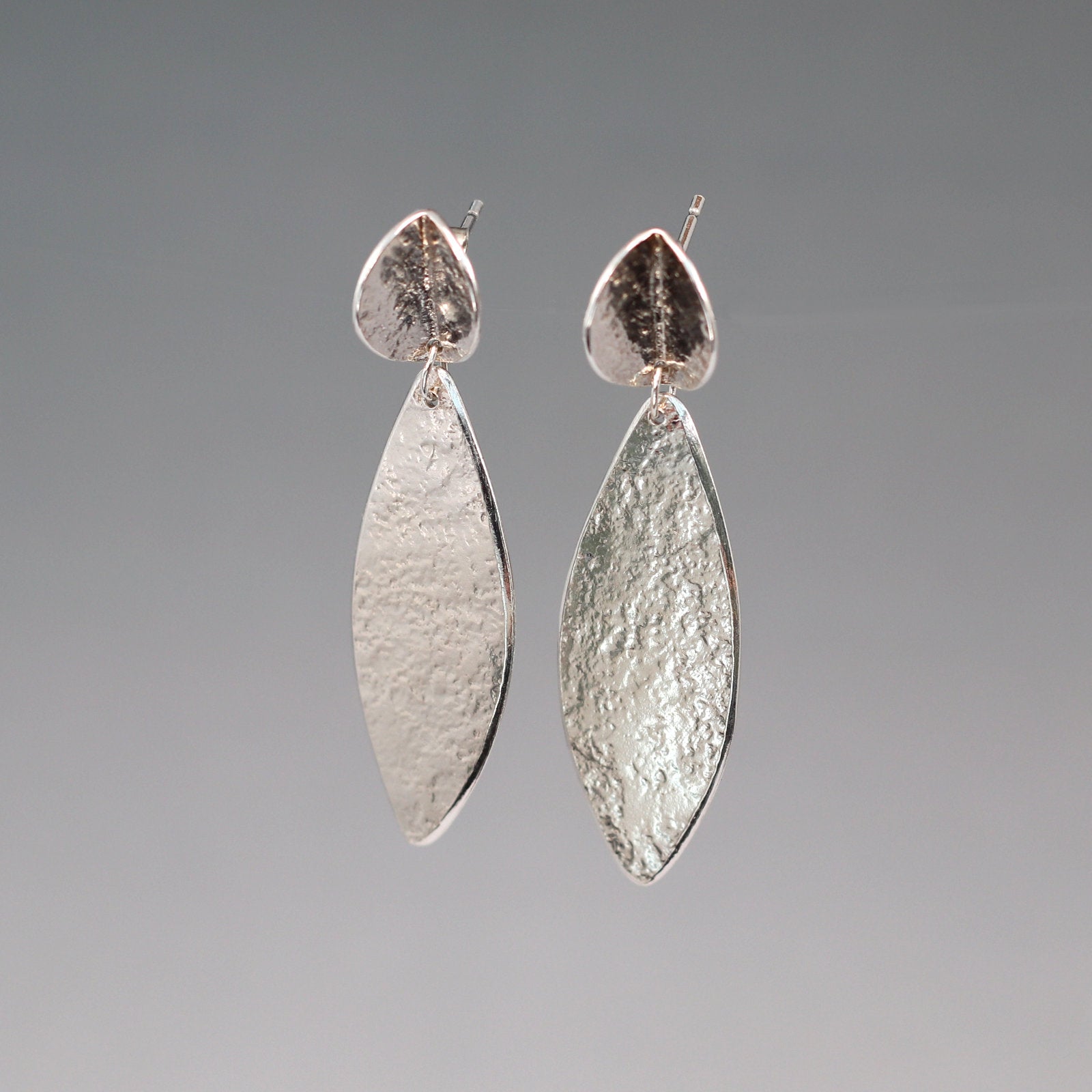 These textured drop earrings are crafted from recycled sterling silver, cut from flat sheet metal then carefully textured, folded, and finished entirely by hand. Each earring is made in two parts and joined by a ring to allow movement when worn. The organic textures and slight variations in finish reflect their handmade nature - no two pairs are exactly alike.